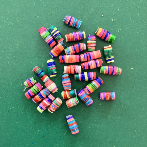 普段はゴミになってしまうかわいい包装紙や紙袋、または使わなくなった紙に自由に色を塗ってリサイクルペーパービーズをつくります。
