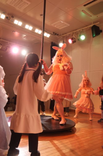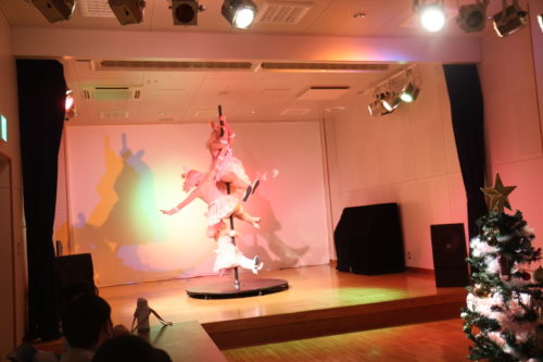 ポールに登って回転する技や、回るKUMIさんの上に乗らせて一緒に回ったり