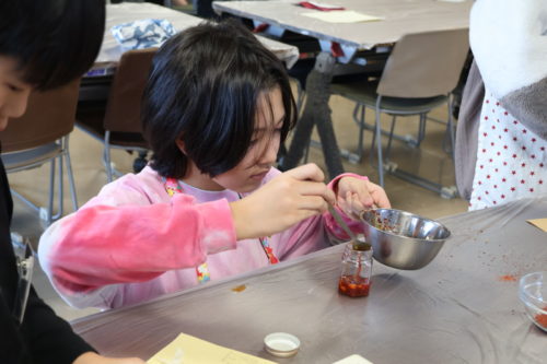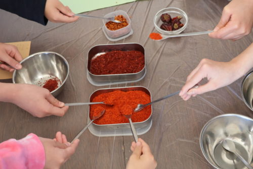 日本の唐辛子と中国の唐辛子を比べながら、形や色、味の違いを教えてもらい、スプーンですくって混ぜ合わせていきます。