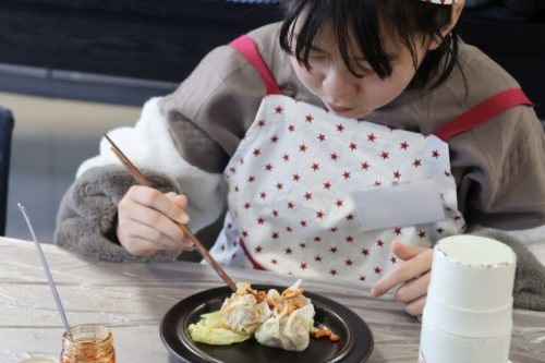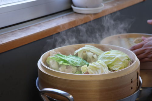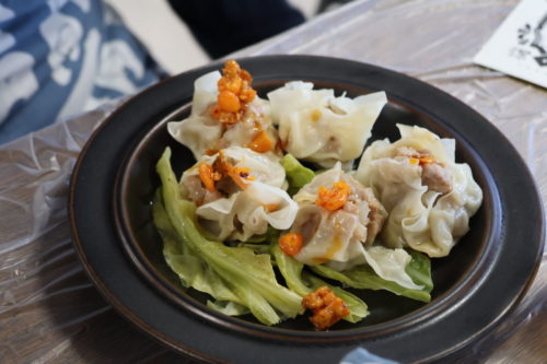 最後は、その場でみんなで包んだ熱々のシュウマイにかけて、いただきます。