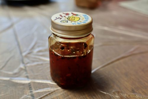 出来上がったオリジナルラー油は瓶に詰め、オリジナルのシールを貼って仕上げました。