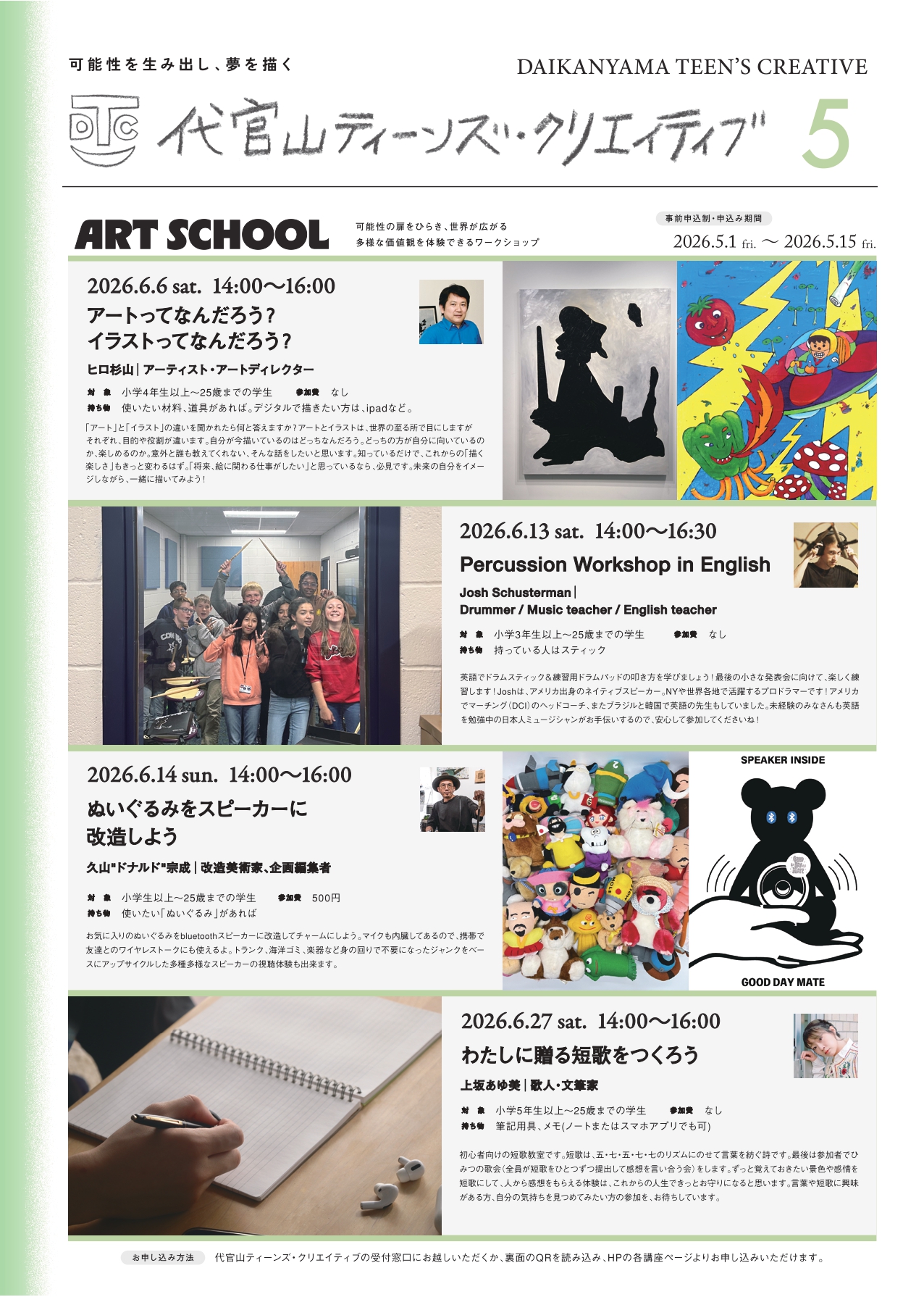 2026/04/09 5月号フライヤー公開のお知らせ 代官山ティーンズ・クリエイティブ 5月号のフライヤーが到着しました。 3月のイベントの様子などを掲載しています。 フライヤーは館内や、渋谷区内の公共施設、学校などで配布されますので ぜひお手に取ってご覧ください。